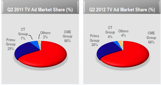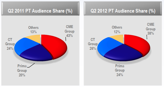 Investorská zpráva zároveň zmiňuje postavení kanálů skupiny Nova na sledovanosti v hlavním vysílacím čase v cílové skupině 15-54 let, kterou považuje za svojí klíčovou. V té za druhé letošní čtvrtletí dosáhla 38% podílu. Nižší podíl než v loňském druhém čtvrtletí přičítá jarním sportovním přenosům (např. Euro 2012). Konstatuje rovněž, že skupina CME si v Česku udržuje silný podíl na publiku, který vytvářejí zejména zpravodajské pořady a pořady domácí tvorby.