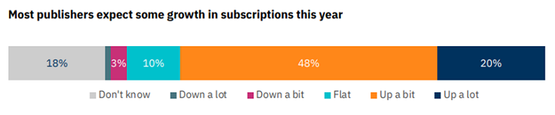 Protože jsou příjmy pod tlakem, chce více vydavatelů investovat do předplatného a dalšího placeného obsahu. Více než dvě třetiny respondentů očekávají zvýšení těchto příjmů (viz obrázek).