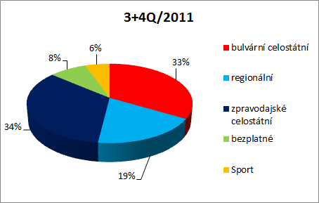 Ve srovnání druhého loňského pololetí s druhým pololetím roku 2010 si alespoň jeden zpravodajský celostátní deník (MF Dnes, Lidové noviny, Právo, Hospodářské noviny) přečetlo 1,482 mil. čtenářů, což byl téměř stejný počet jako o rok dříve. Alespoň jeden bulvární deník pak ve stejném období četlo 1,447 mil. čtenářů (o 50 tis. méně než o rok dříve). Znamená to, že zpravodajské celostátní deníky se v loňském druhém pololetí dostaly nad celkovou čtenost bulvárních deníků.