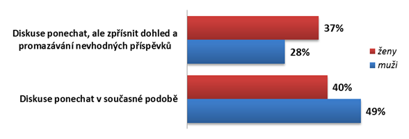 K ponechání diskusí v současné podobě se kloní více muži (49 %), lidé s vysokoškolským vzděláním (48 %) a čtenáři zpravodajského serveru iDnes.cz (51 %). Ženy pak ve větší míře než je tomu u mužů zmiňují zpřísnění dohledu a promazávání obsahu v diskusích (37 %).