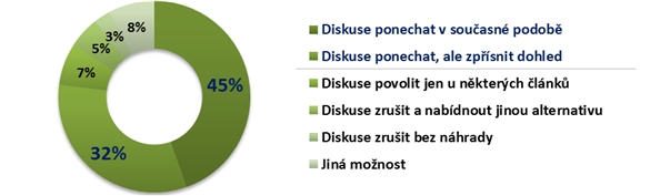 45 % lidí si přeje ponechat diskuse pod články na zpravodajských serverech ve stávající podobě. Dalších 32 % se kloní také k ponechání diskusí, ale připouští zpřísnění dohledu a promazávání nevhodného obsahu. Pouze 3 % čtenářů uvádí jako nejvhodnější variantu zrušení diskusí bez náhrady.
