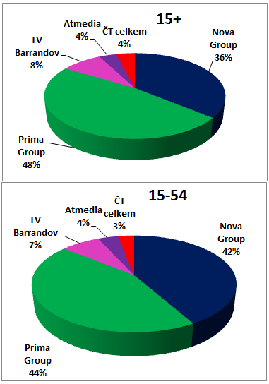 Objem prodaných reklamních TRPs v letošním říjnu byl rovněž nižší než ve stejném loňském období. Ve skupině diváků starších 15 let má stále nejvyšší podíl skupina Prima (48 %), v mladší skupině 15-54 jsou podíly obou nejsilnějších skupin vyrovnanější.